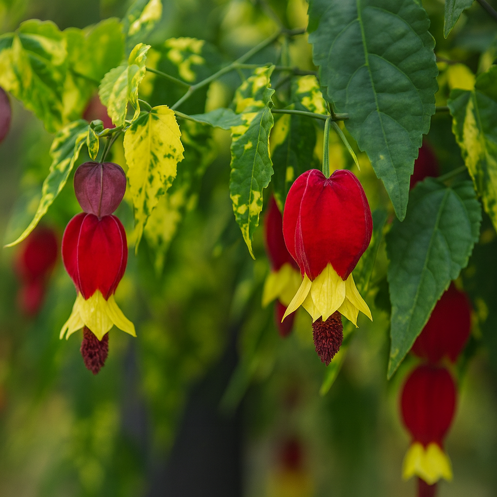 A Abutilon Variegata é uma planta ornamental sofisticada, conhecida por sua folhagem mesclada em tons de verde e creme, que ilumina qualquer ambiente e cria destaque imediato em jardins ou vasos. Suas flores delicadas em formato de pequenas lanternas, em vermelho e amarelo, pendem graciosamente dos ramos, trazendo movimento e um toque exótico.