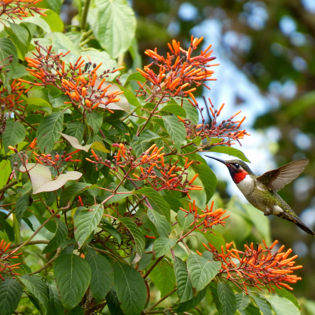A Amélia (Hamelia patens) é um arbusto tropical extremamente ornamental e versátil nativo dos EUA, conhecido por sua floração vibrante em tons de vermelho-alaranjado que atrai grande quantidade de beija-flores e borboletas. Com crescimento rápido e visual exuberante, é uma excelente escolha para jardins que buscam cor intensa e vida, além de ser bastante resistente e de fácil manutenção.