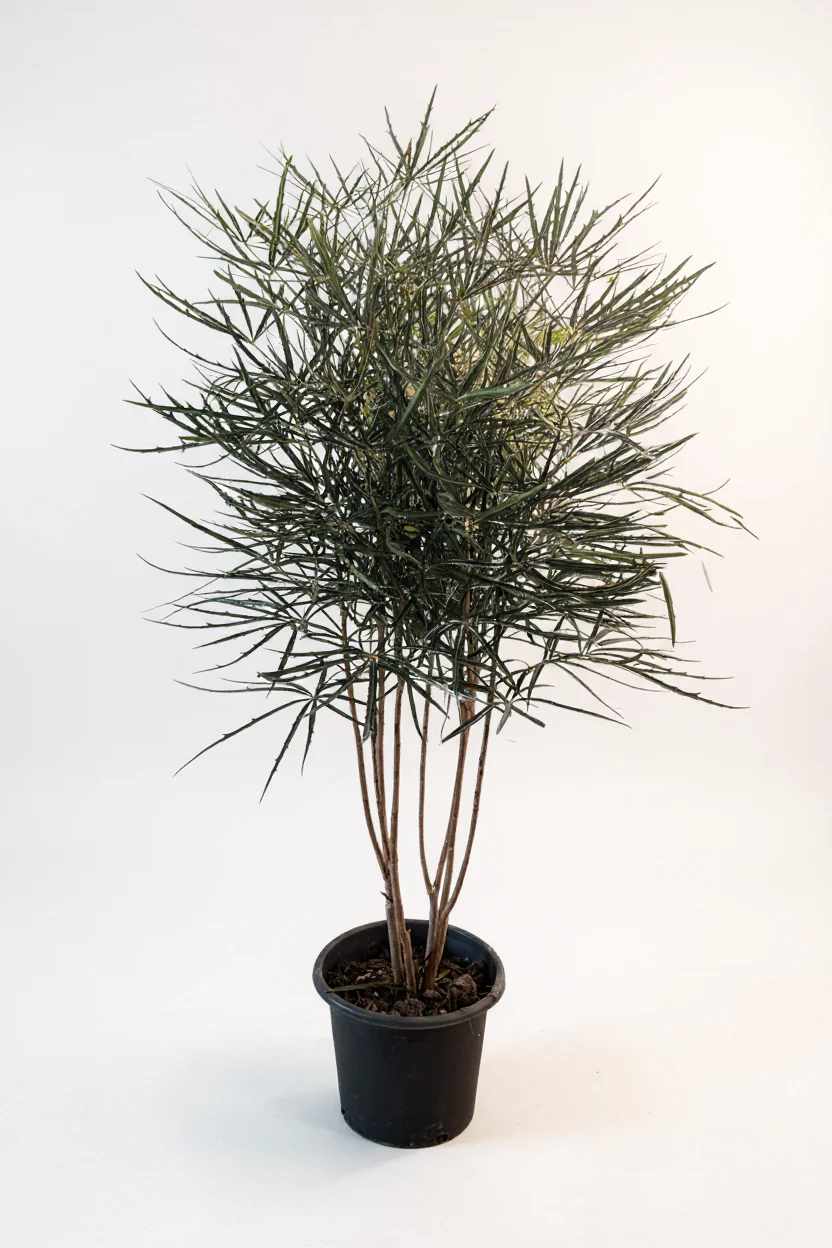 A Arália ou Falsa Arália (Plerandra elegantissima) é uma planta ornamental muito apreciada pelo seu aspecto elegante e exótico. Suas folhas longas, estreitas e profundamente recortadas conferem um visual sofisticado, tornando-a destaque em ambientes internos e externos protegidos. É uma espécie de crescimento moderado, que se adapta bem ao cultivo em vasos ou jardins sombreados, sendo bastante utilizada em projetos de paisagismo contemporâneo. A muda com 1,20 a 1,50 m já apresenta porte bem formado, ideal para uso decorativo imediato.