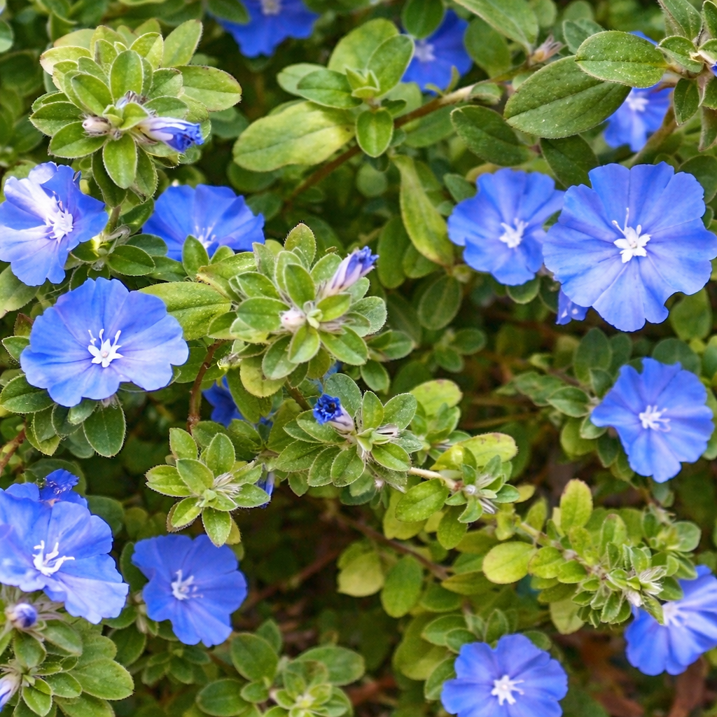 A Azulzinha ou Evólvulo é uma planta herbácea perene, muito apreciada por seu florescimento abundante e pela intensa coloração azul de suas pequenas flores. Forma um tapete denso e ornamental, sendo perfeita para canteiros, bordaduras e vasos suspensos, além de funcionar muito bem como forração em áreas ensolaradas.