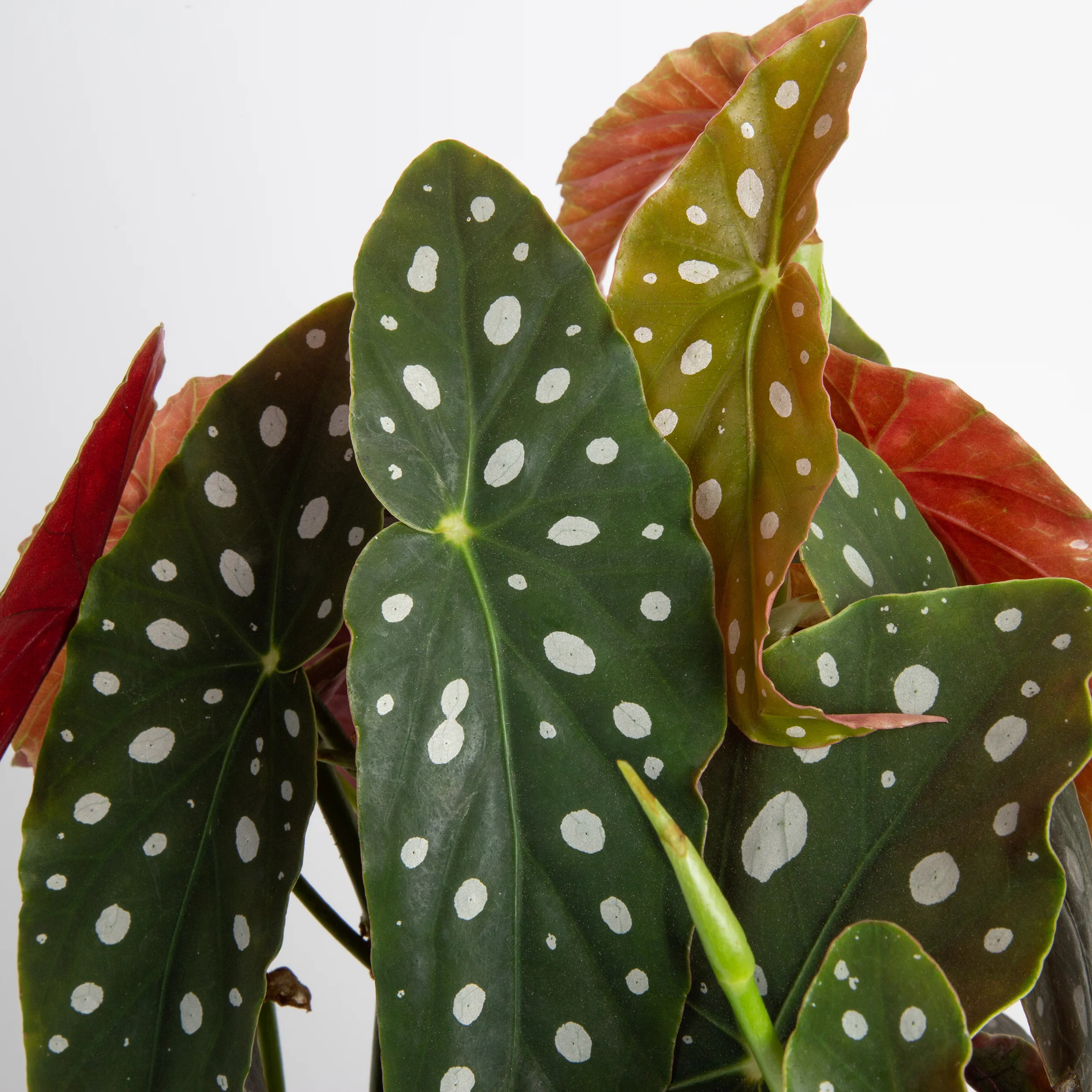 A Begonia Maculata é uma planta de folhagem marcante, com folhas verde-escuras alongadas repletas de pontos prateados e verso avermelhado. No pote 17, apresenta porte mais estruturado, excelente para decoração de interiores com luz indireta. Destaca-se pelo visual sofisticado e pelo rápido impacto ornamental. Suas flores surgem em cachos brancos ou rosados, adicionando leveza ao conjunto e tornando-a uma das espécies mais desejadas entre colecionadores de folhagens. É uma das plantas mais usadas em decorações internas.