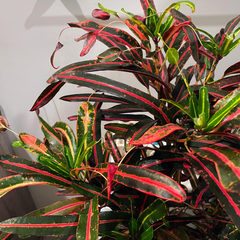 O Cróton Bell é uma variedade ornamental muito apreciada por suas folhas estreitas, recurvadas e altamente coloridas. Também conhecida como Cróton Bell Verde, Cróton de Folha Fina e Cróton Tipo Bell, apresenta uma folhagem longa e delicada, marcada por tons vibrantes que podem incluir verde, amarelo, laranja e vermelho, criando um efeito elegante e sofisticado. No pote 11, já mostra excelente volume e presença decorativa.