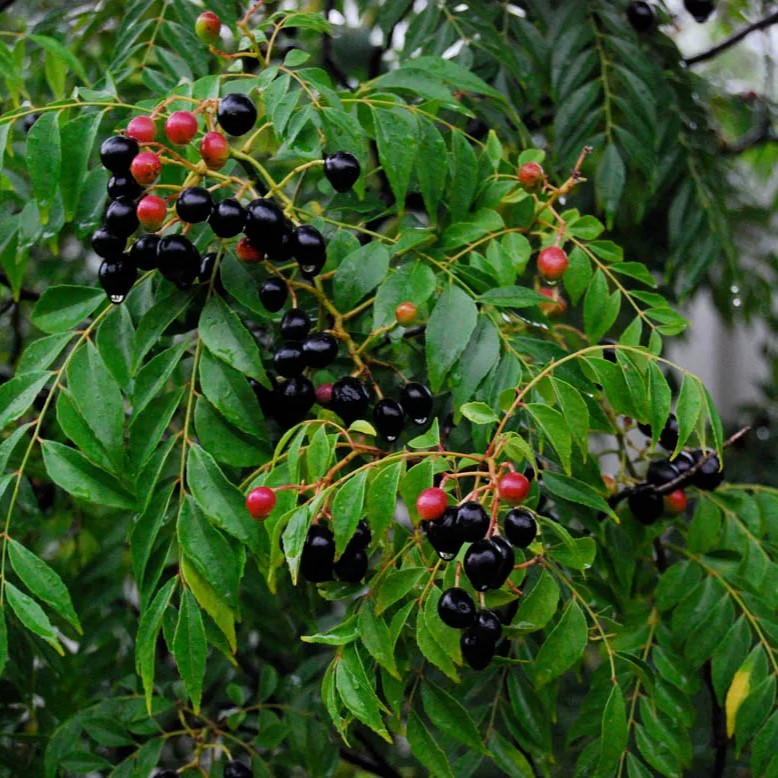 Floresce com pequenas flores brancas, seguidas de frutinhos negros (não comestíveis).