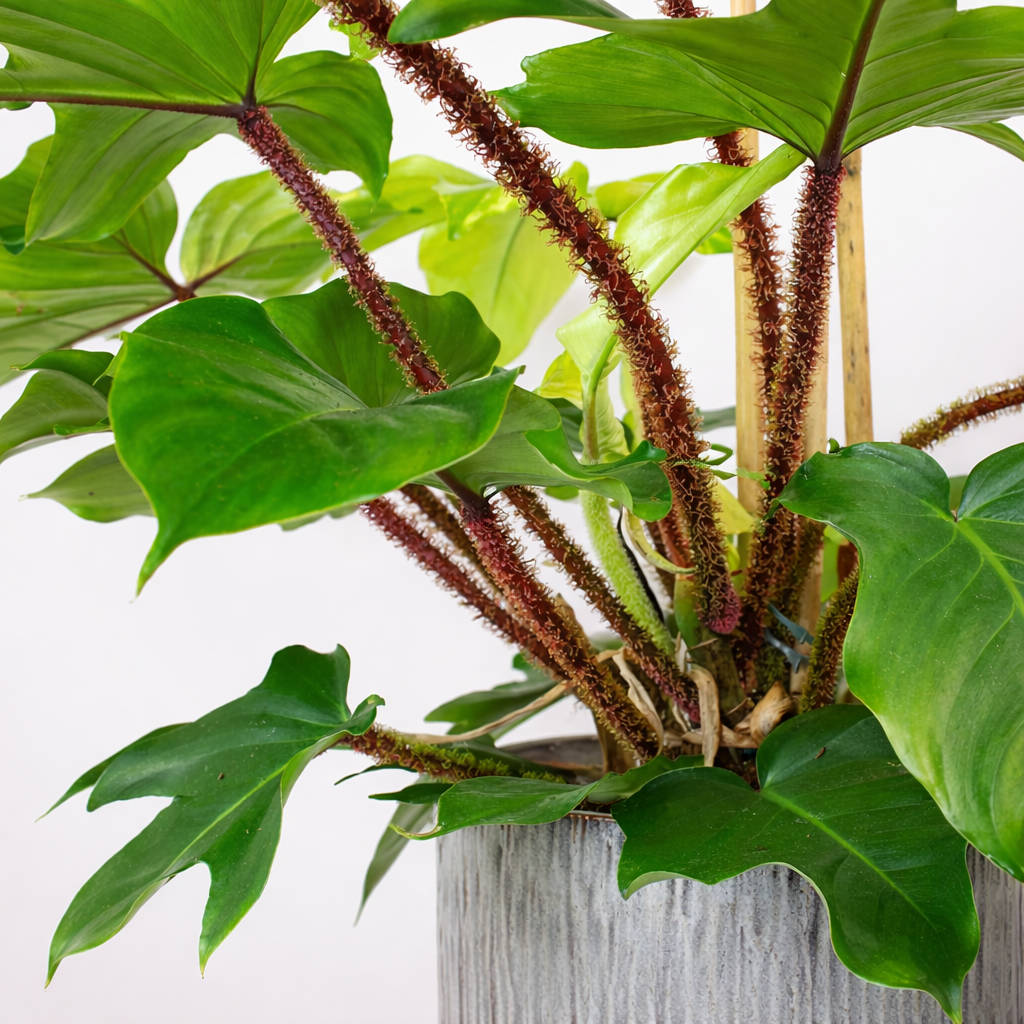 O Filodendro Peludo apresenta folhas grandes, profundamente lobadas, com textura firme e aspecto tropical marcante. Seus caules e pecíolos possuem pelos rígidos e avermelhados, característica rara entre os filodendros, o que aumenta seu valor ornamental. É uma planta de crescimento escandente, podendo ser conduzida com tutor para melhor desenvolvimento e valorização estética.