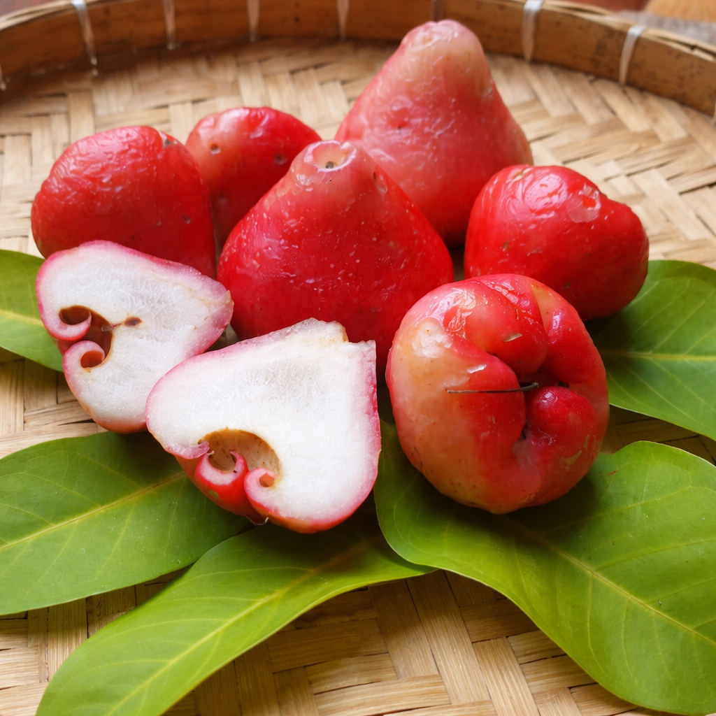 O Jambo Rosa é uma frutífera tropical muito valorizada tanto pela beleza de sua copa quanto pela produção de frutos delicados e refrescantes. Suas mudas, com até 1 metro, desenvolvem-se em árvores de médio porte, que podem atingir entre 6 e 12 metros de altura. Os frutos possuem formato de sino, casca rosada e polpa branca ou rosada, suculenta e adocicada, sendo consumidos in natura ou no preparo de sucos, saladas de frutas e geleias. Além da frutificação, a árvore tem grande valor ornamental devido às flores abundantes e vistosas, que atraem polinizadores.