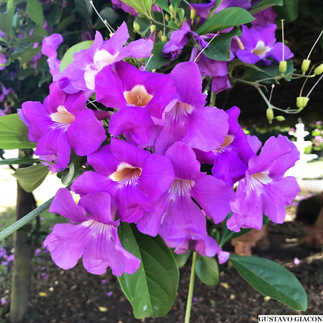 A Saritéia é uma trepadeira ornamental de grande efeito paisagístico, conhecida pela sua beleza exuberante e flores em tonalidades arroxeadas que se destacam entre a folhagem verde intensa. De crescimento vigoroso e com capacidade de cobrir cercas, pérgolas, caramanchões e muros, é uma ótima opção para quem deseja dar um toque tropical e colorido ao jardim. Sua floração é abundante e atrai polinizadores, como beija-flores e borboletas, tornando o ambiente ainda mais agradável e cheio de vida.