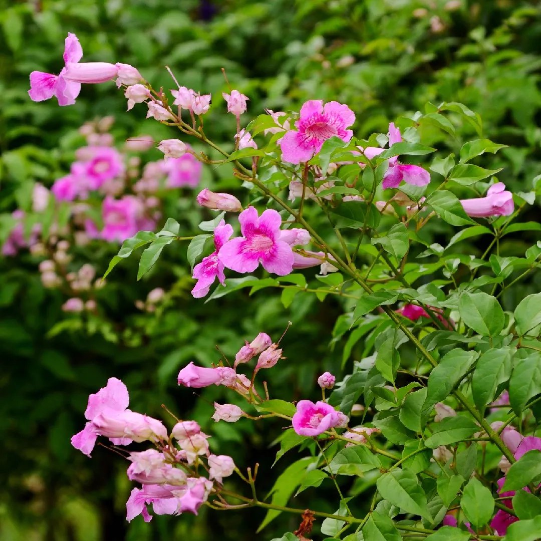 A Sete Léguas é uma trepadeira ornamental conhecida por suas flores exuberantes, geralmente rosa ou lilás, que surgem em cachos durante a primavera e o verão. É ideal para cobrir treliças, muros, pérgolas e cercas, conferindo charme e movimento ao jardim. Possui crescimento vigoroso e folhagem densa, proporcionando sombra parcial quando cultivada verticalmente.